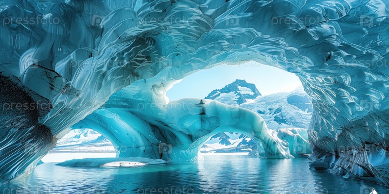 Холодный пейзаж с гротами и арками на краю тающего ледника на берегу