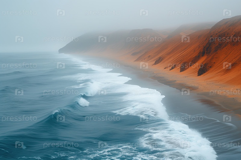 Вид с воздуха на морской прибой на туманном берегу, где встречаются пустыня и океан