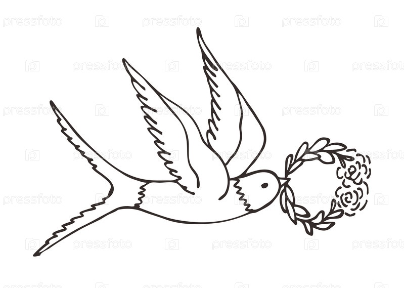 Векторная иллюстрация ласточки с цветочным венком, контурный рисунок