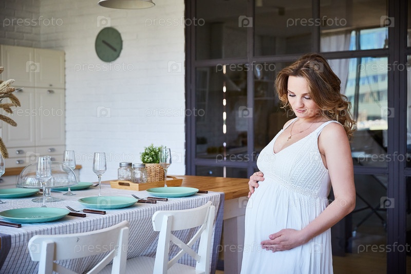Молодая беременная девушка на кухне с накрытым столом