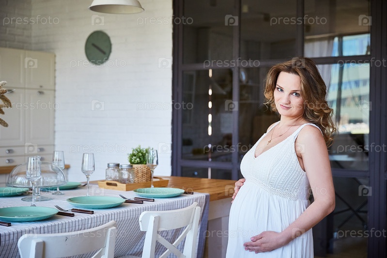 Красивая беременная молодая женщина в кухне-столовой своего светлого чистого дома