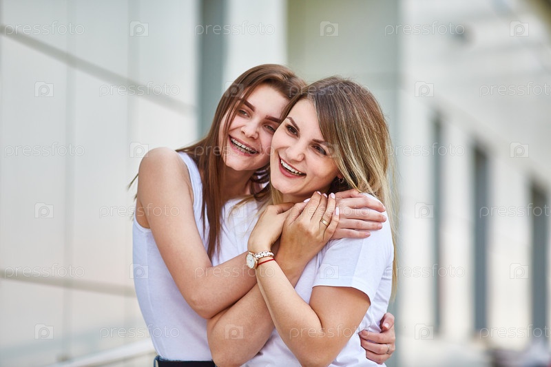 Взрослая дочь обнимает маму, и обе улыбаются в камеру