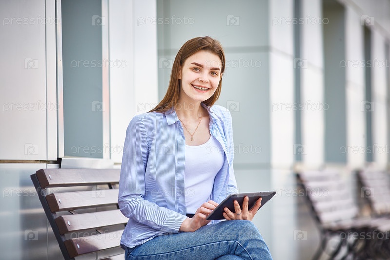Молодая девушка сидит на скамейке с планшетом в руках и улыбается