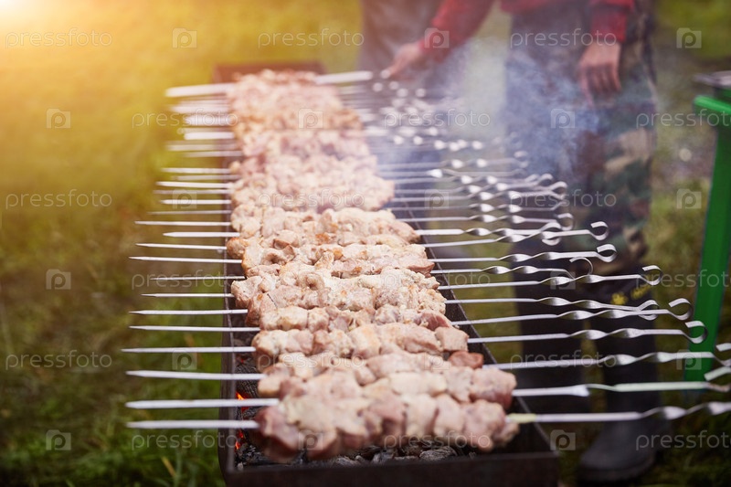 Шашлыки с большим количеством шампуров с мясом жарится