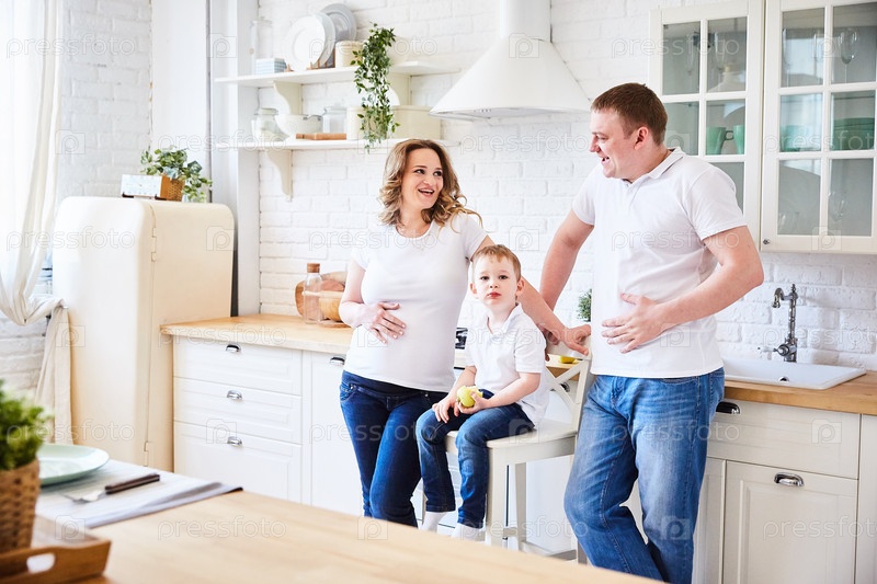 Семья с маленьким ребенком и беременной молодой женщиной на кухне. Понятие семьи, любви и верности
