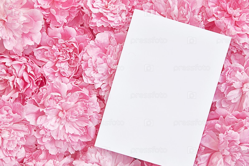 Белый лист бумаги на цветочном розовом фоне. Концепция весны и нежности