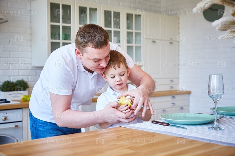 Мальчик с отцом на кухне. Ребенок ест яблоко. Понятие семьи и отцовства. Копировать пространство