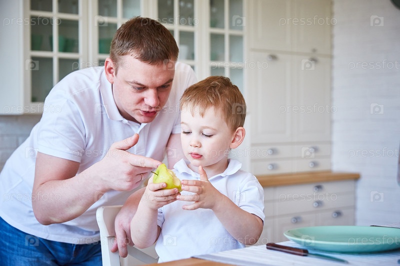 Папа и его маленький сын обсуждают яблоко и здоровую пищу на просторной светлой кухне