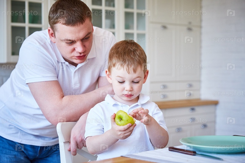 Мальчик с отцом на кухне. Ребенок ест яблоко. Копировать пространство