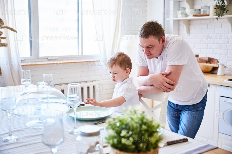 Папа и мальчик накрывают стол для праздничного ужина и ждут прихода гостей на праздник