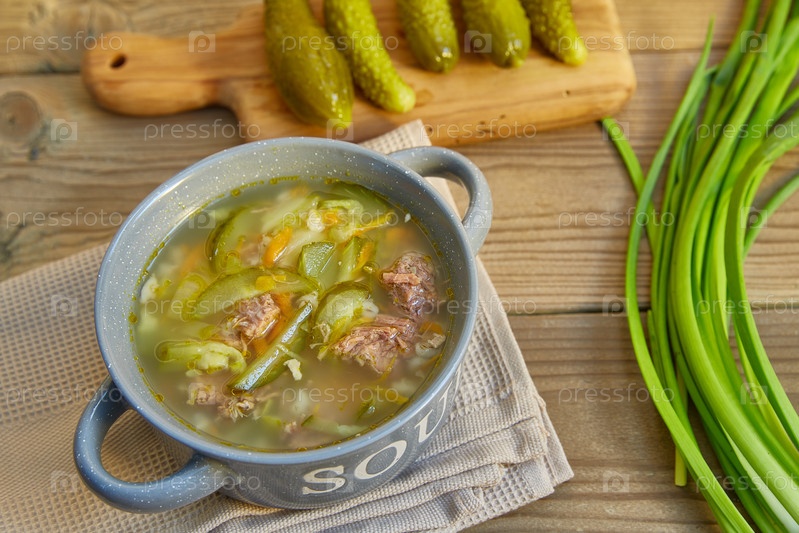 Национальная русская украинская, польская кухня. Блюдо рассольный суп с ферментированными солеными огурцами. На деревянном коричневом фоне с копировальным пространством