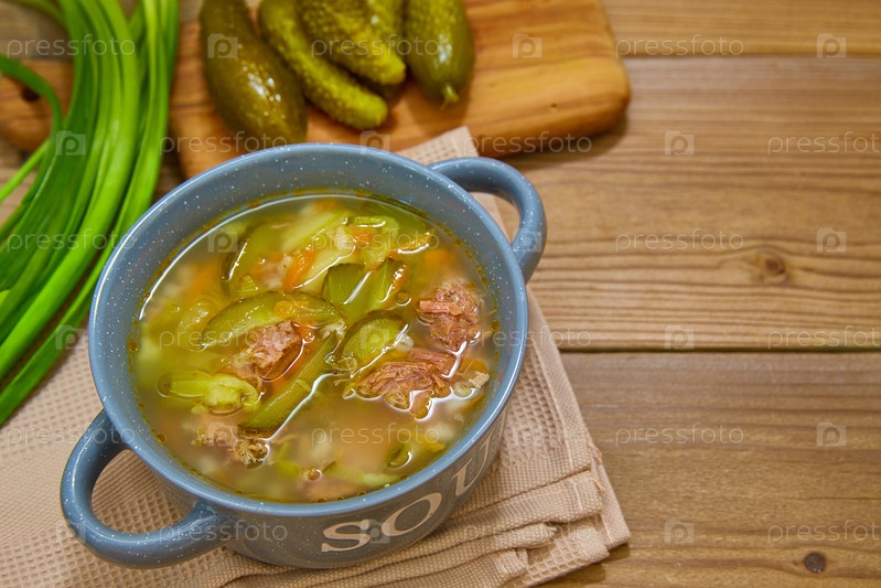 Национальная русская украинская, польская кухня. Блюдо рассольный суп с квашеными соленьями