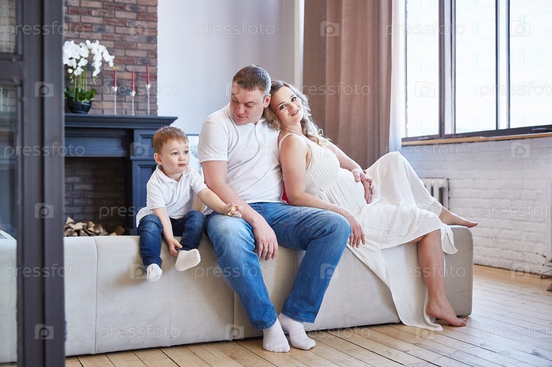 Кавказская семья с маленьким мальчиком и беременной женой с животом в гостиной