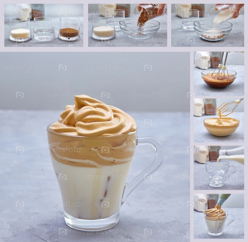 Дальгона кофе. Коллаж пошагового приготовления. Новый корейский тренд в напитках. Смешать в одинаковых пропорциях кофе, сахар, воду. Взбить. Готовую пену выложить на молоко