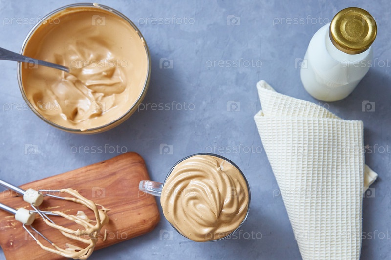 Dalgona coffee trend корейский напиток латте эспрессо на сером бетонном фоне. вид сверху, плоская планировка