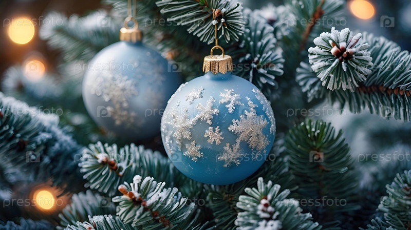 Красивые рождественские синие шары и еловые ветки на светлом фоне. Падает снег. Традиционные рождественские и новогодние украшения