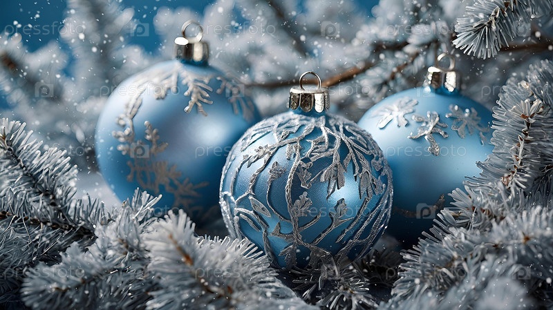 Красивые рождественские синие шары и еловые ветки на светлом фоне. Падает снег. Традиционные рождественские и новогодние украшения