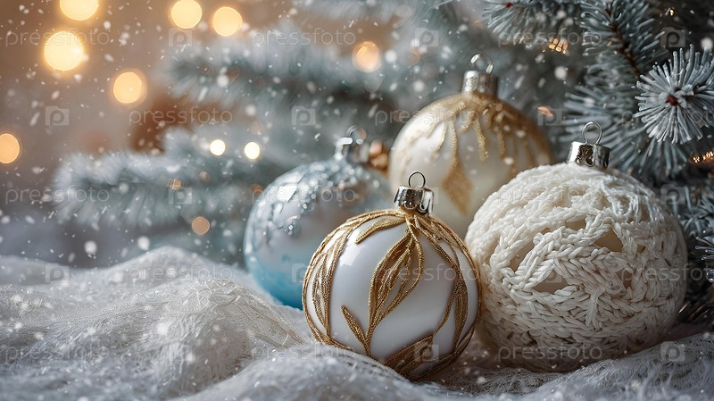 Красивые рождественские белые, молочные шары и еловые ветки на светлом фоне. Падает снег. Традиционные рождественские и новогодние украшения
