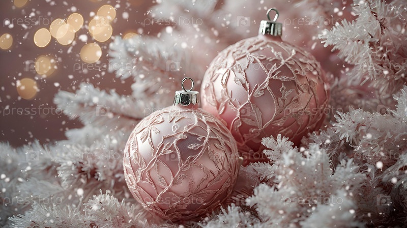 Красивые рождественские розовые шары и еловые ветки на светлом фоне. Падает снег. Традиционные рождественские и новогодние украшения