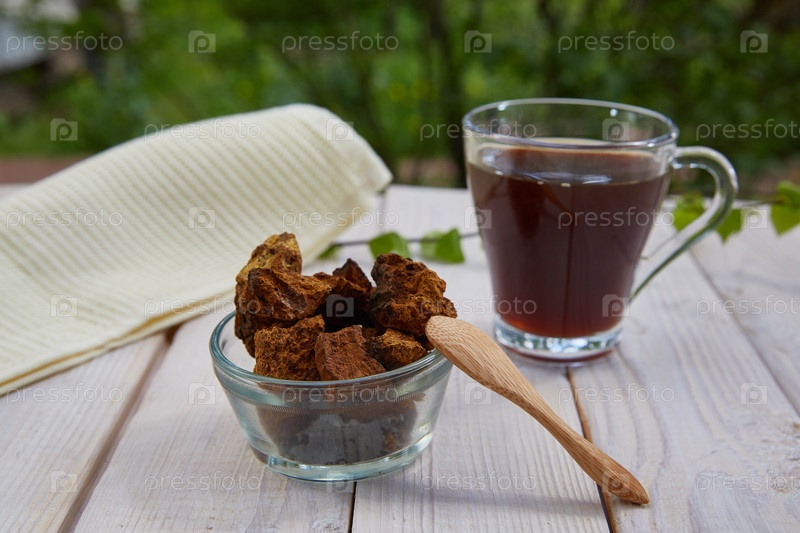 Сушеный гриб чага и чай из чаги на деревянном белом столе на фоне леса