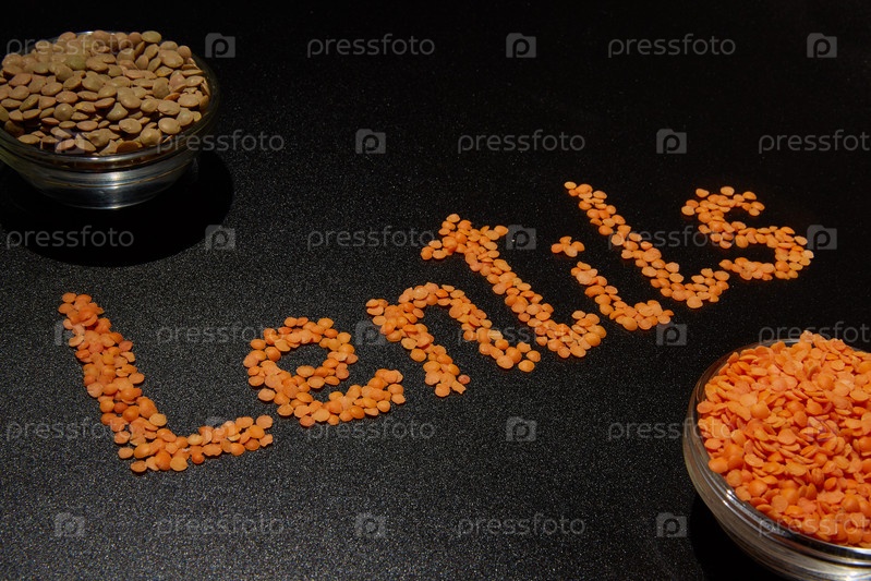 Два вида линз на темном фоне и слово lentils в английском языке