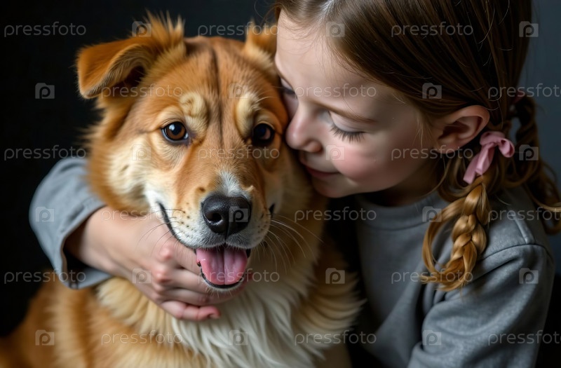 Ребенок обнимает питомца, дружба собаки и ребенка, темный фон. Генеративный искусственный интеллект