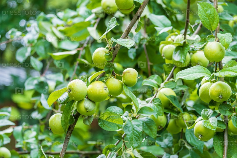 В солнечный день на ветвях, окруженных густой листвой, созревают зеленые яблоки