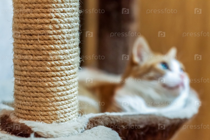 Кошачья когтеточка в кошачьем доме, рыжий кот на заднем плане