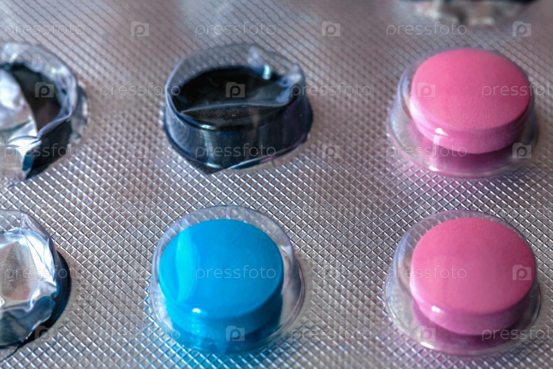 Три таблетки, красные и синие в блистере, крупный план