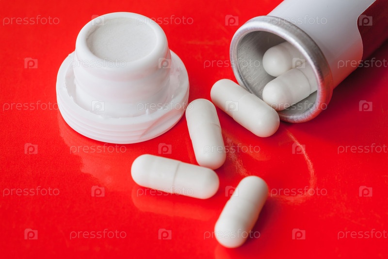 Белые капсулы высыпаются из контейнера, красный фон, крупный план