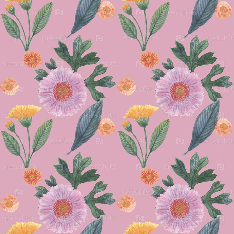 Акварельный паттерн с цветами и листьями на розовом