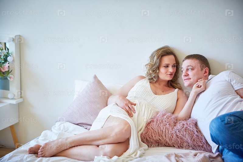 Молодая пара влюбленных лежит на кровати и разговаривает утром. Копировать пространство