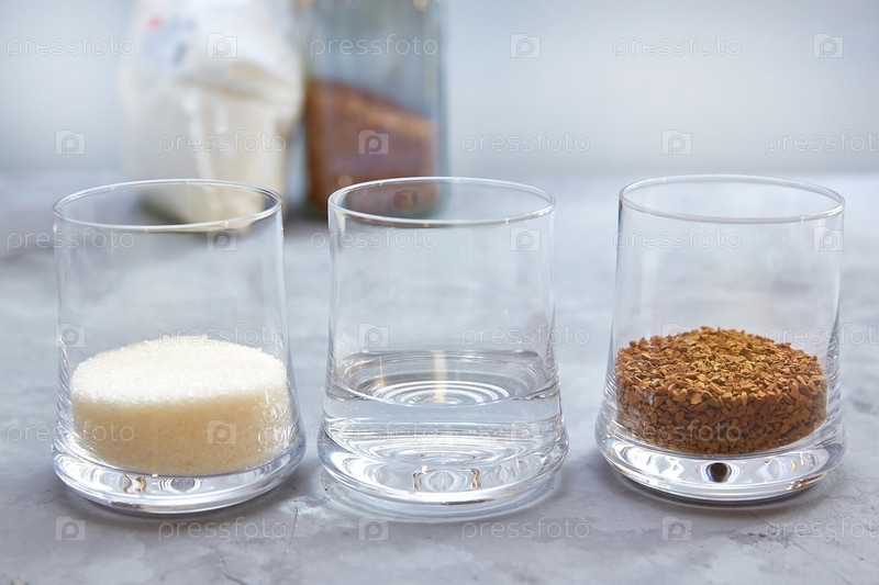 Шаг 1. Состав и пропорции для приготовления дальгона-кофе. Кофе, сахар и вода в соотношении 1:1:1