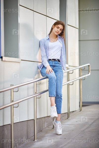 Девочка-подросток возле здания института. школьный двор перед уроками. Новый учебный год. Добро пожаловать обратно в школу. Полное тело