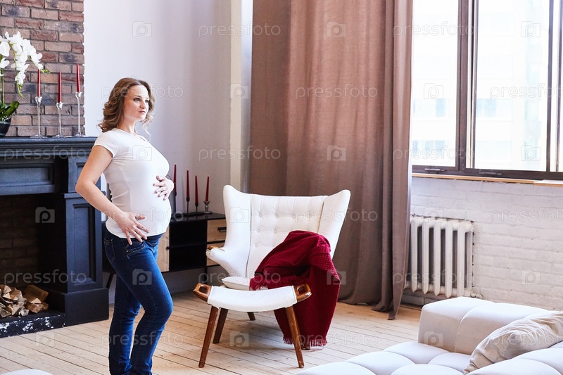 Беременная девушка стоит в гостиной и трогает свой живот