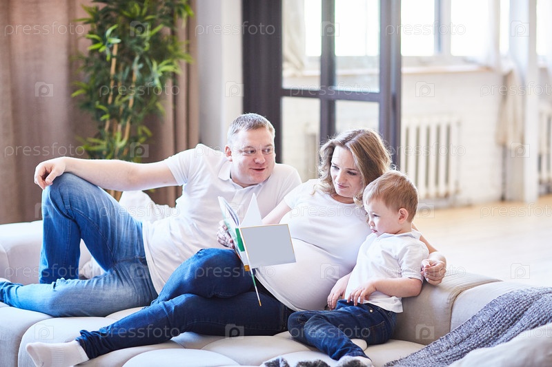 Семья с маленьким ребенком сидит на диване и читает книгу