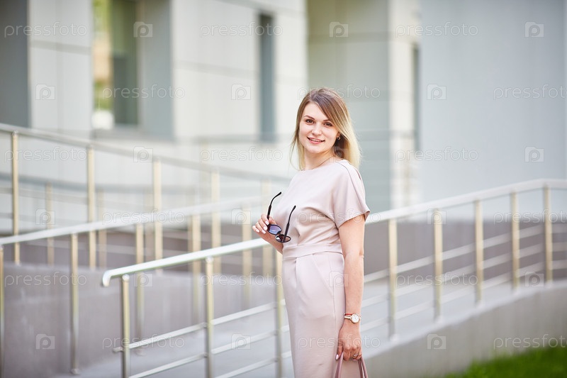 Кавказская молодая женщина в красивом платье на улице смотрит в камеру и улыбается
