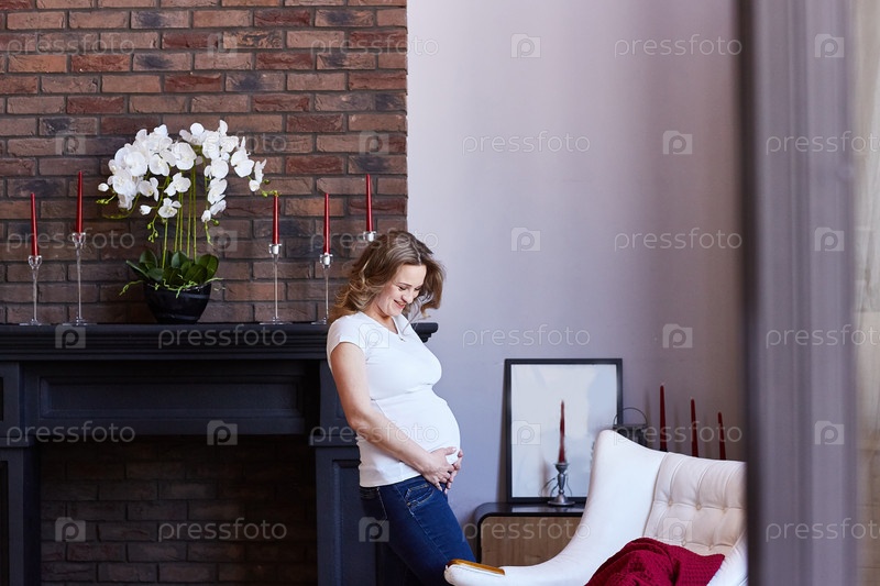 Беременная женщина развлекается, поглаживая свой живот в гостиной