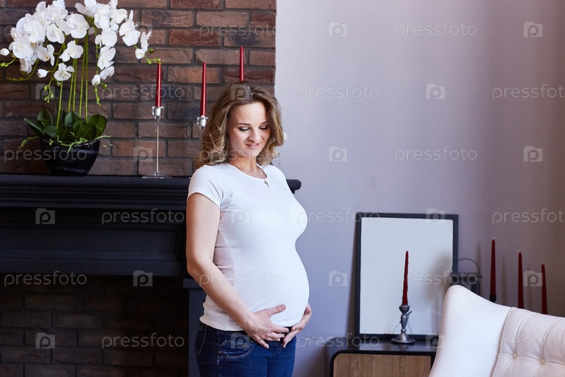 Беременная женщина улыбается и гладит свой живот в гостиной. Копировать пространство