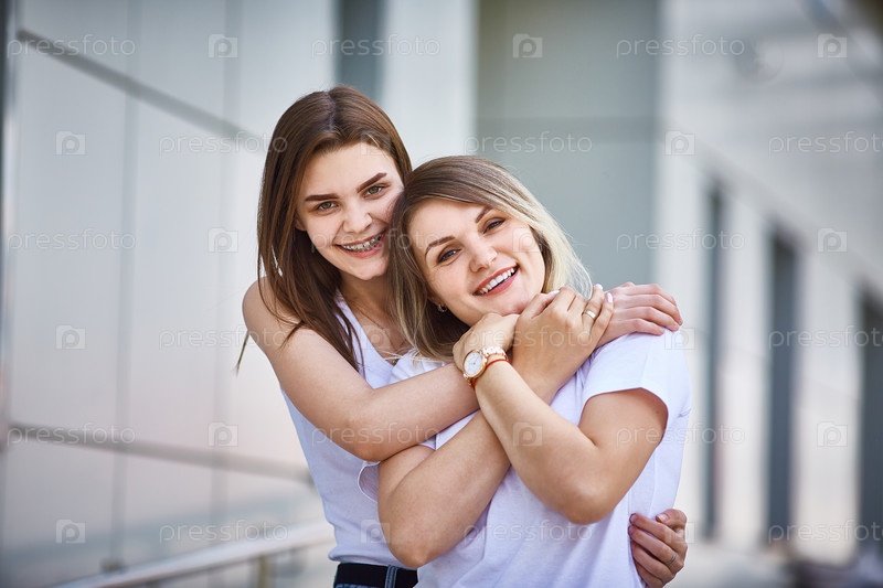 С Днем матери. Взрослая дочь целует свою мать, и обе счастливы, стоя на улице в ярких одеждах в летний день