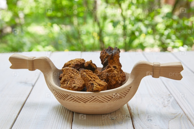 Ломтики гриба чага лежат на деревянной тарелке на деревянном фоне с лесным расфокусом