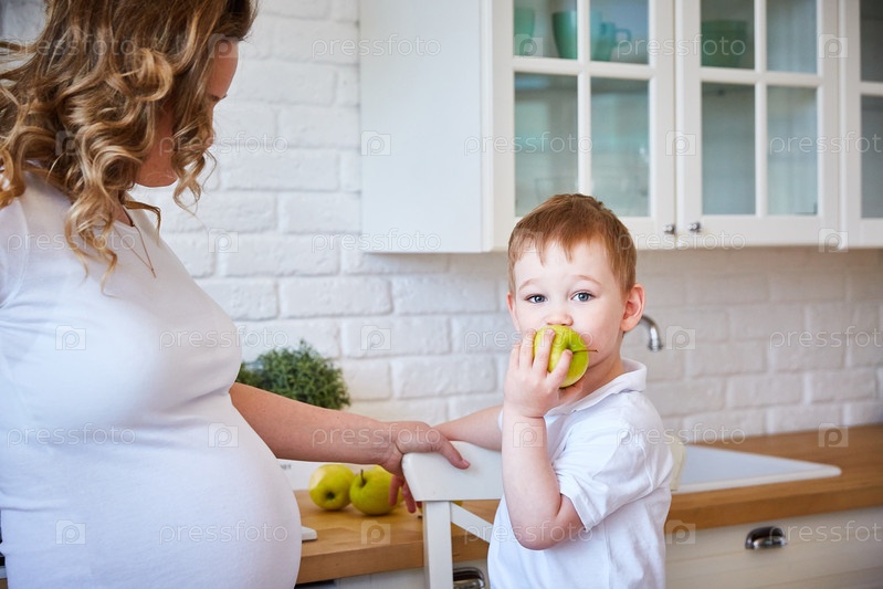 Мальчик смотрит в кадр и ест яблоко на кухне рядом со своей беременной матерью