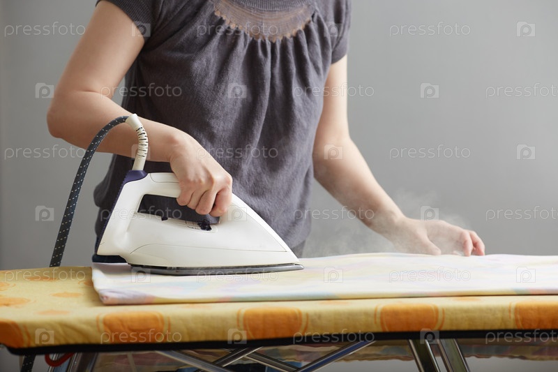 Женские руки держат белый утюг и утюг на гладильной доске. Крупный план. Безликий. Копировать пространство на сером фоне. Домашние обязанности и уход за домом