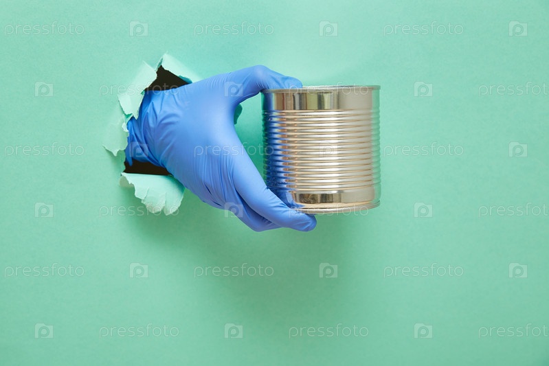 Рука в синей защитной резиновой перчатке держит железную банку с тушеным мясом. Копия космического зеленого фона