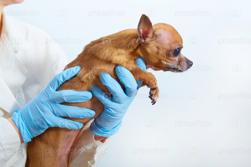 Собака чихуахуа из рук ветеринара крупным планом. На белом фоне с копировальным пространством. Баннер для ветеринарной клиники. Копировальное пространство