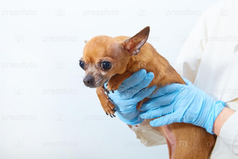 Маленькая собака в руках ветеринара. Копировать пространство