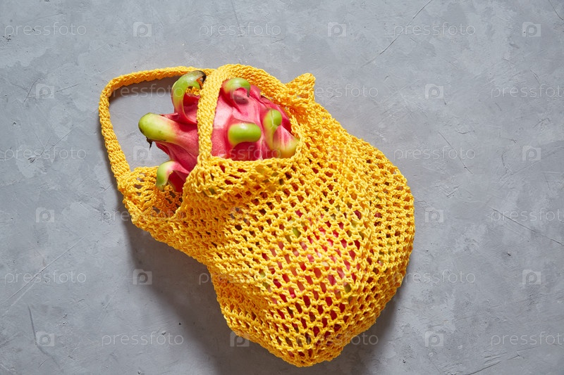 Тропический драконий фрукт в авоське на сером бетонном фоне. Покупка еды в экологически чистой сумке. Забота об окружающей среде, отказ от пластика, ноль отходов, концепция переработки