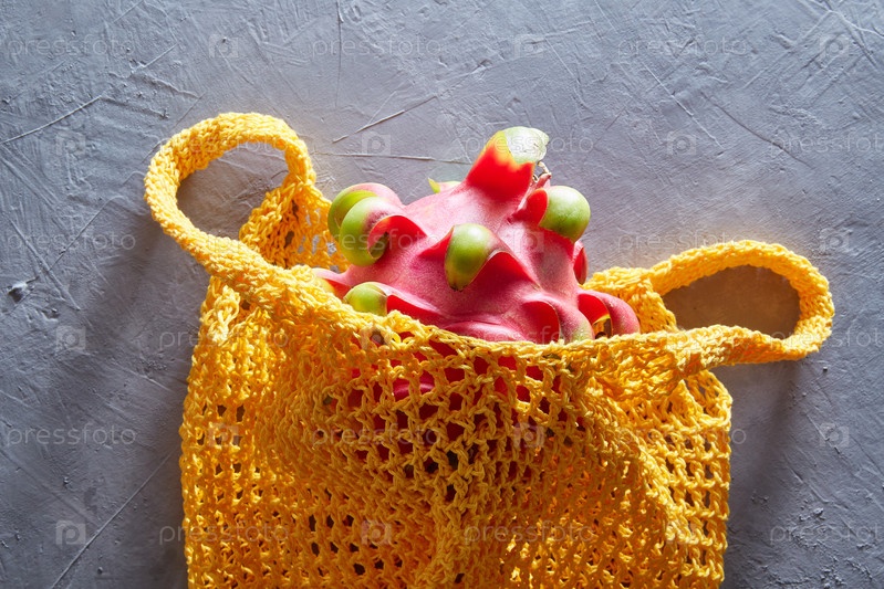 Тропический драконий фрукт в авоське на сером бетонном фоне. Покупка еды в экологически чистой сумке. Забота об окружающей среде, отказ от пластика, ноль отходов, концепция переработки