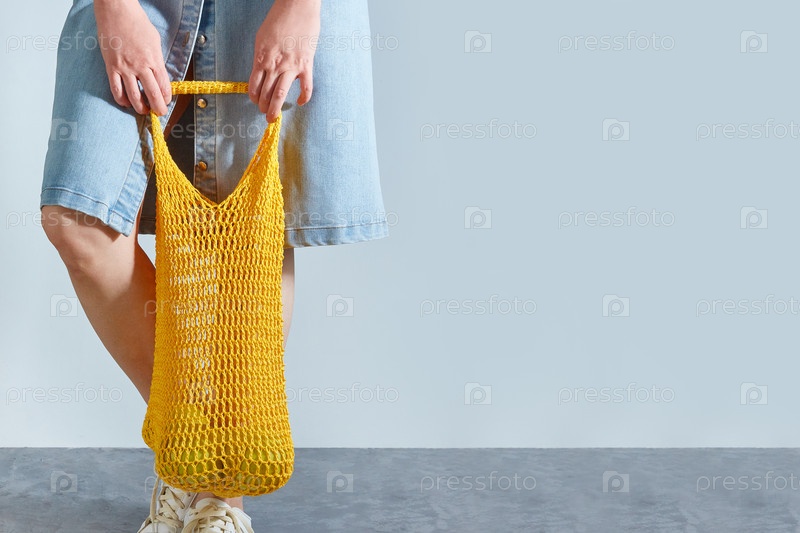 Авоська с яблоками в женских руках с местом для копирования. Ноль отходов и экология. Концепция устойчивого образа жизни