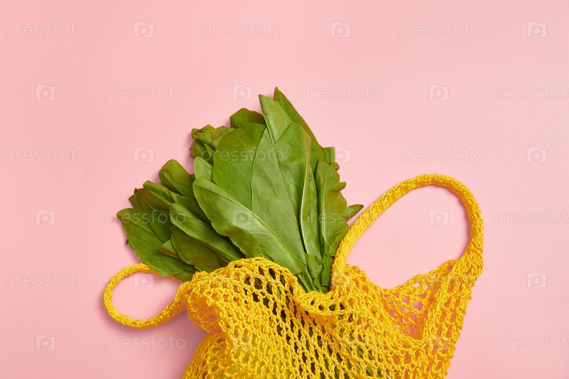 Зеленые листья щавеля в желтой авоське на розовом фоне. Ноль отходов. Хлопок
